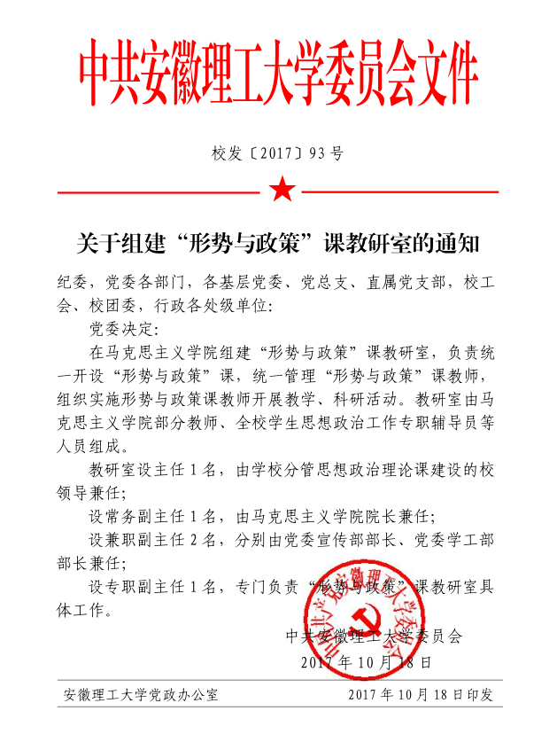 为了切实推进高校思政课教学质量年专项工作,不断增强学生思政课获得感,10月18日,校党委印发了《关于组建“形势与政策”课教研室的通知》,决定在马克思主义学院组建“形势与政策”课教研室,负责统一开设“形势与政策”课,统一管理“形势与政策”课教师,组织实施“形势与政策”课教师开展教学、科研活动。教研室由马克思主义学院部分教师、全校学生思想政治工作专职辅导员等人员组成。教研室设主任1名,由学校分管思政课建设的校领导担任;设常务副主任1名,由马克思主义学院院长兼任;设兼职副主任2名,分别由党委宣传部部长、党委学工部部长兼任;设专职副主任1名专门负责“形势与政策”课教研室具体工作。