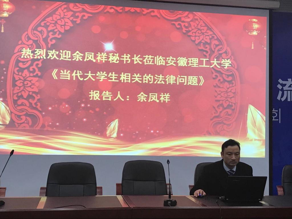 1月4日下午,马克思主义学院开展以案说法实践教学活动,邀请淮南市律师协会秘书长、安徽铸志律师事务所执行主任余凤祥律师在校图书馆报告厅举办了题为《与当代大学生相关的法律问题》的知识讲座。讲座由马克思义学院思想政治教育教研室主任李子煊副教授主持。全校近400名师生聆听了讲座。