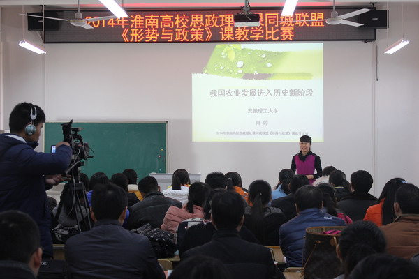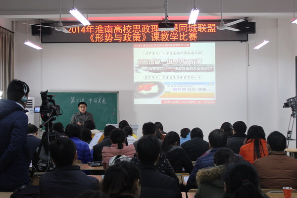 12月19日下午,2014年淮南高校思政理论课同城联盟《形势与政策》课教学比赛暨安徽高校思政理论课同城联盟建设交流会在淮南师范学院召开。教育厅思政处林鑫德处长、张英明主任、安徽财经大学思政部主任汪先平教授、安徽农业大学思政部主任方章东教授、阜阳师范学院思政部主任闫成俭教授、皖西学院思政部主任郝先中教授、安徽大学出版社饶涛编审出席活动并担任比赛评委,淮南师范学院副院长马建国、党委副书记杨正清出席交流会,淮南同城六校思政部负责人和部分教师参加活动。我校选派教师肖婷、王琦获得二等奖。