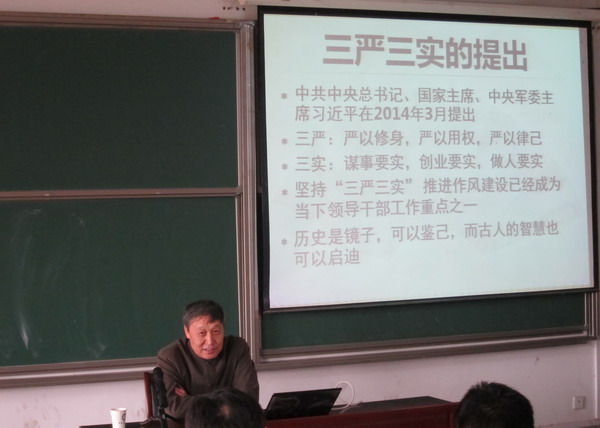 柏桦教授的报告主要从“三严三实”的提出、中国古代廉政文化的产生、中国古代廉政文化的基本特点、中国古代廉政人物、“三严三实”与中国现代廉政文化的关系、如何做到为政莫忘“三严三实”等六个方面进行了解读和阐释,观点鲜明、思想深邃、眼光独到、妙趣横生。