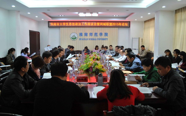 10月29日下午,由中共淮南市委宣传部、淮南市青少年网络思想政治教育研究中心、淮南高校思想政治理论课同城联盟联合举办的“淮南市大学生思想政治工作座谈会暨同城联盟2015年论坛”在淮南师范学院行政办公楼314会议室隆重举行。淮南师范学院党委书记陈年红、副院长王正明,淮南市委宣传部常务副部长汤洁,市文明办、团市委、教育局、淮南广播电视台、淮南日报社等单位负责人出席会议。我校党委宣传部部长吴照明、校团委副书记彭晶、外国语学院党委副书记陈秀霞,我部教师韩剑尘、徐其清与淮南同城六所高校有关领导、宣传部、思政部负责人、思政课骨干教师及大学生代表等50余人参加了会议。会议由淮南师范学院副院长王正明教授主持。