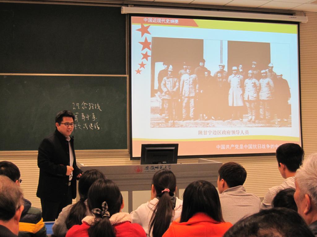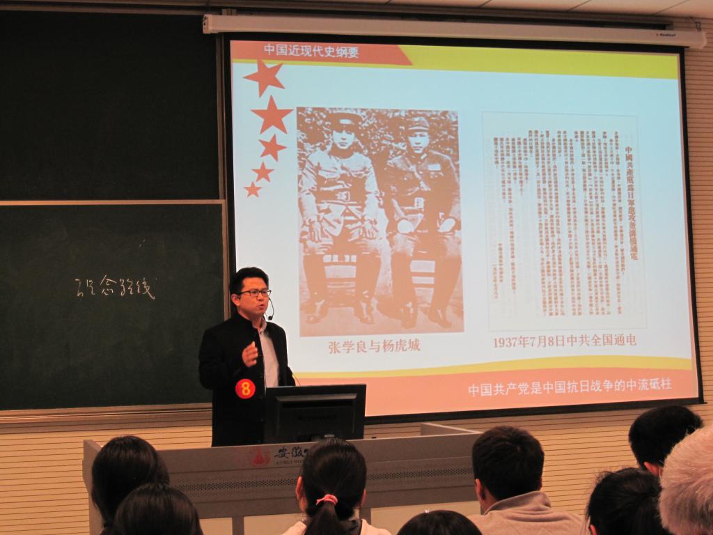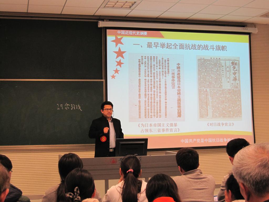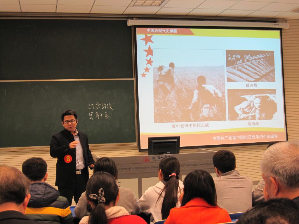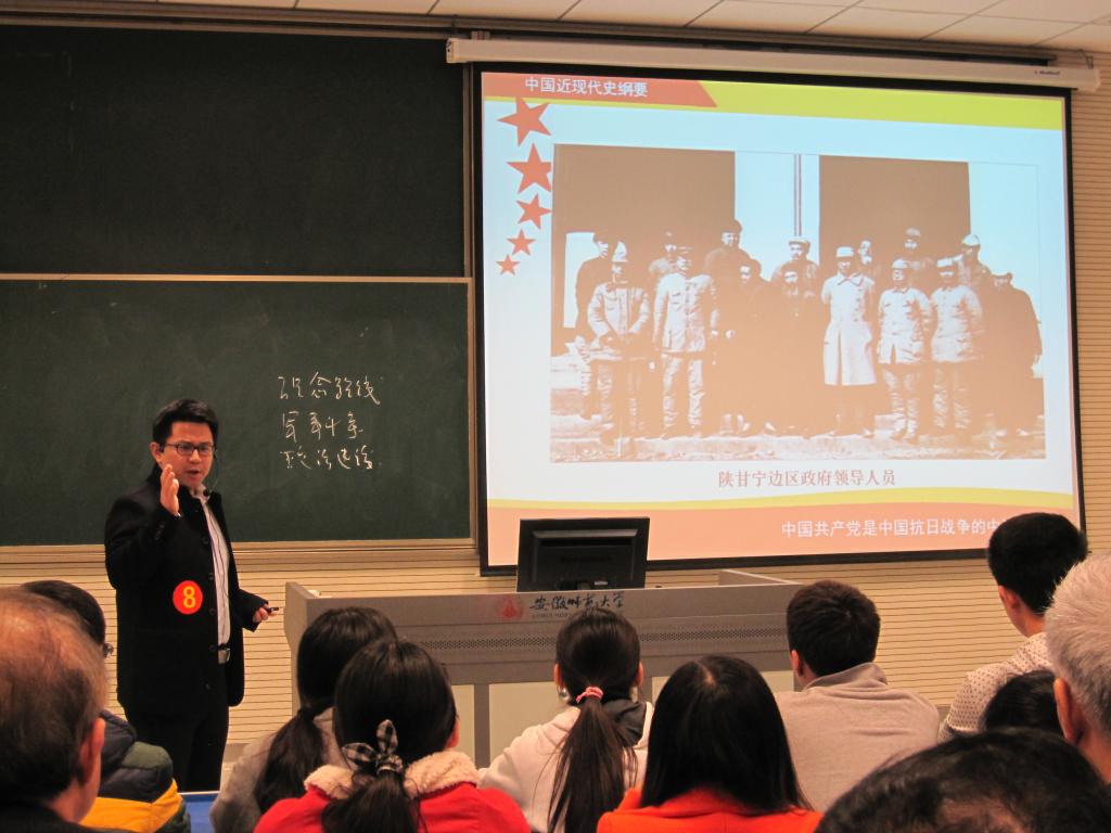 按照惯例,比赛采取现场讲课和现场答辩两种形式。参赛选手根据各门课程的指定章节自选教学内容进行15分钟的现场讲课,同时现场抽题进行5分钟的答辩。评委根据选手的上述表现进行现场打分。高旭老师参赛内容为“中国近代史纲要”课程中的“中国共产党是抗日战争的中流砥柱”部分。讲课运用大量详实的史料与数据,在回溯并评析国共两党在抗战期间的选择与表现的基础上,全面而深刻地讲述了“为什么中国共产党才是抗日战争的中流砥柱”这一重大理论问题。在比赛过程中,由于各种意外因素的影响,讲课几度被打断,但高旭老师凭借扎实的理论功底沉着应对,克服各种干扰因素,以饱满的热情感染了现场听课的同学,以机敏而又准确的答辩获得评委专家的一致好评,充分展现了我校教师认真从教、灵活教学的良好风貌。