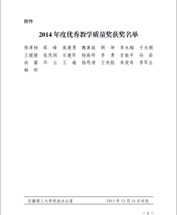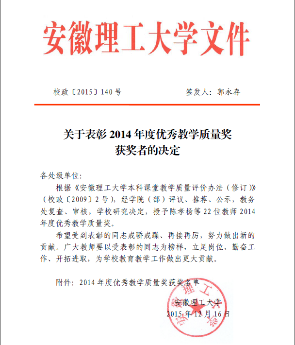 根据《安徽理工大学本科课堂教学质量评价办法(修订)》(校政〔2009〕2 号),经学院(部)评议、推荐、公示,教务处复查、审核,学校研究决定,授予李军生等22 位教师2014年度优秀教学质量奖。