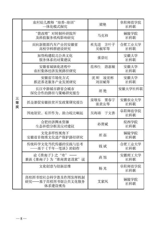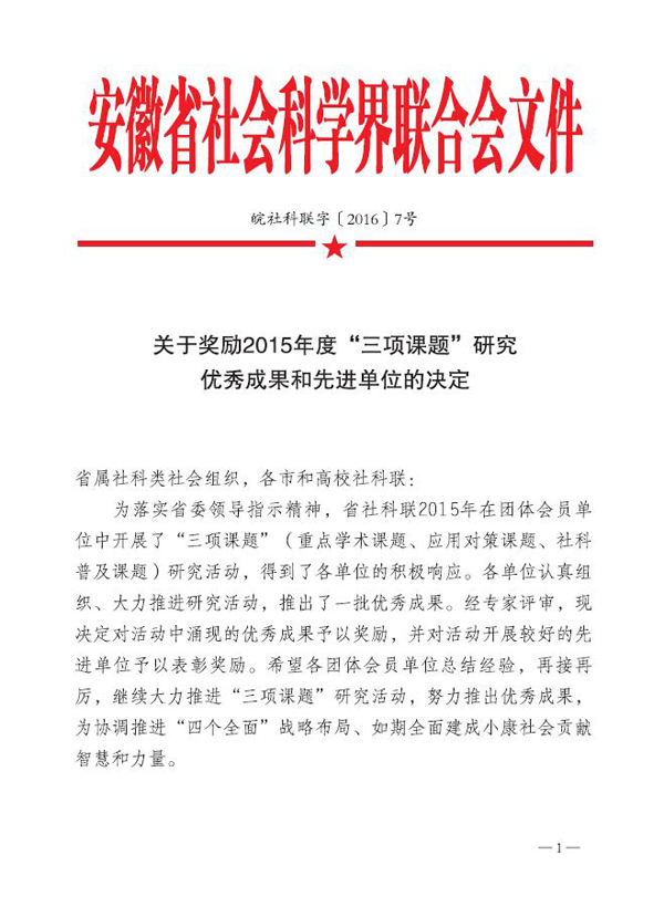 2015年,安徽省社科联在全省社科联单位中展开“三项课题”(重点学术课题、应用对策课题、社科普及课题)的研究活动,并对各单位的报送成果进行专家评审,表彰奖励其中的优秀成果。通过“三项课题”的研究活动,安徽省社科联力求在我省人文社科研究方面推出更多的精品成果,为协调推进我省“四个全面”战略布局,加快建设创新型“三个强省”,提供强大的思想保证、智力支持和理论支撑。