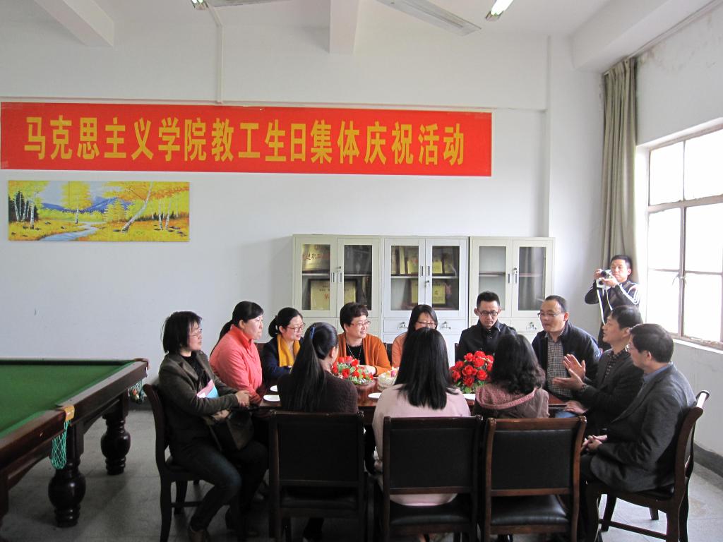 4月1日上午10:00,马克思主义学院分工会在院工会活动室为生日在第一季度的13名教职工举办生日集体庆祝活动。学院领导与教职工20余人欢聚一堂,齐唱《生日快乐》歌,同品香甜蛋糕,共话学院发展。庆祝活动由院分工会主席朱广亮主持。