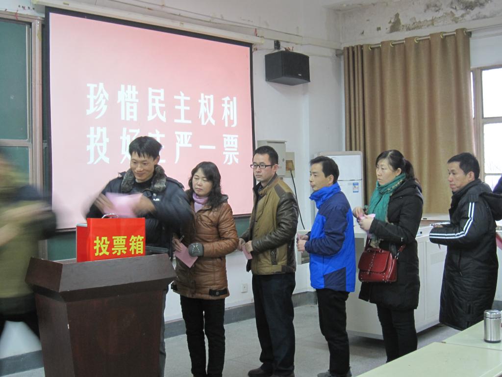 在庄严地国歌声中,全体教职工有序前往投票箱,投下自己神圣的一票。
