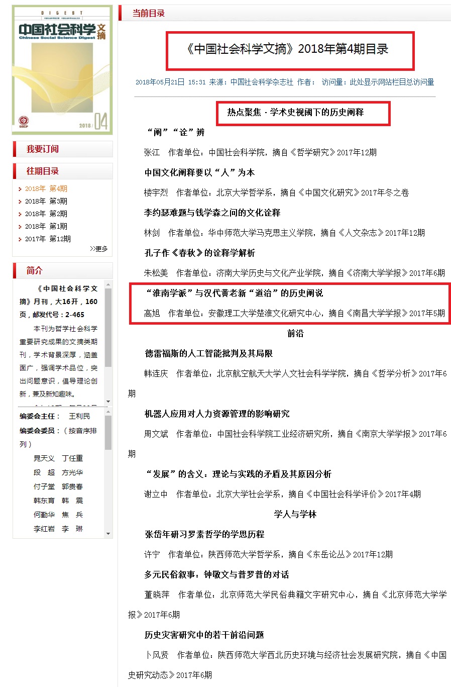 马克思主义学院高旭副教授论文《汉代黄老新“道治”的历史阐说——论〈淮南子〉著述意图、文本结构、思想体系及其政治理想》(《南昌大学学报(人文社会科学版)》,2017年第5期,全文1.4万字)被《中国社会科学文摘》(2018年第4期)重点栏目“热点聚焦·学术史视阈下的历史阐释”以《“淮南学派”与汉代黄老新“道治”的历史阐说》为题全文转载。