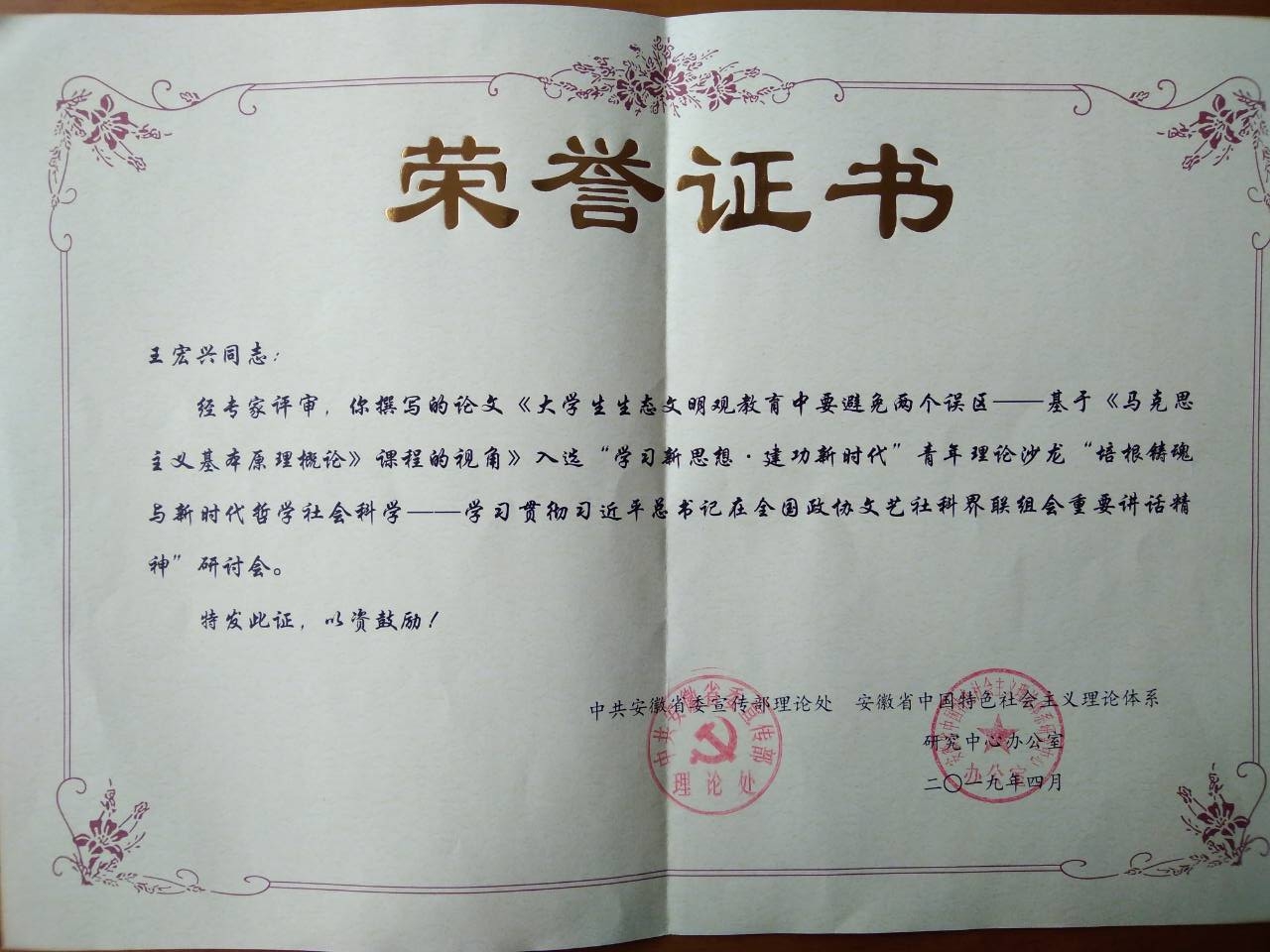王宏兴老师以《大学生生态文明观教育中要避免两个误区》一文参加了活动征文,并应邀参加了活动。省内各高校和科研院所的青年专家及安徽省中国特色社会主义理论体系研究中心基地负责同志80余人参加了研讨。