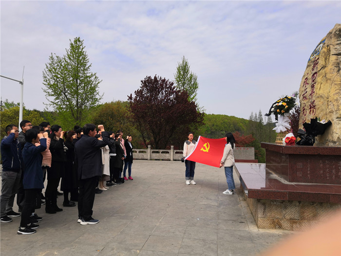 党课结束后,党员们依次瞻仰了纪念林内的碑文、雕塑,并在“新四军精神永放光芒”纪念碑前举行了“重温入党誓词”的宣誓活动。学院党总支书记、院长孙功带领全体党员,面对鲜红的党旗,齐声共诵入党誓词。