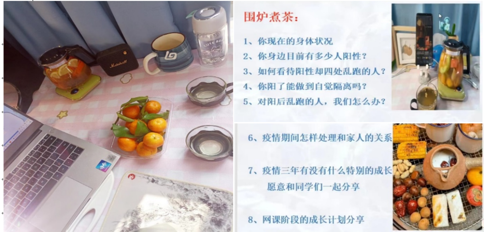 自去年12月以来,受新冠疫情的影响,学校实行线上教学。学习环境和学习方式的变化,使得与疫情相伴三年的同学们在思想上出现一定的波动,学习积极性也有所降低。为了帮助同学们缓解焦虑情绪,化解思想中的迷茫,直面生活与学习中的困难,马克思主义学院青年教师汪蕾将其创办的品牌栏目《小蕾姐有话说》搬到了思政课堂上,并筹划了这期“抗阳”特辑——线上围炉煮茶活动。