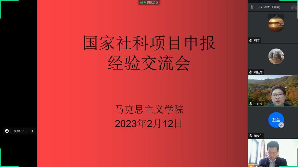为帮助学院教师提升国家级科研项目申报能力,提高广大教师从事科研工作的积极性,2月12日上午,学院举办了2023年度国家社科项目申报经验交流会。来自省内外高校的7位专家和学者应邀线上指导。会议由院长朱广亮主持,学院领导、科研骨干参加了交流会。