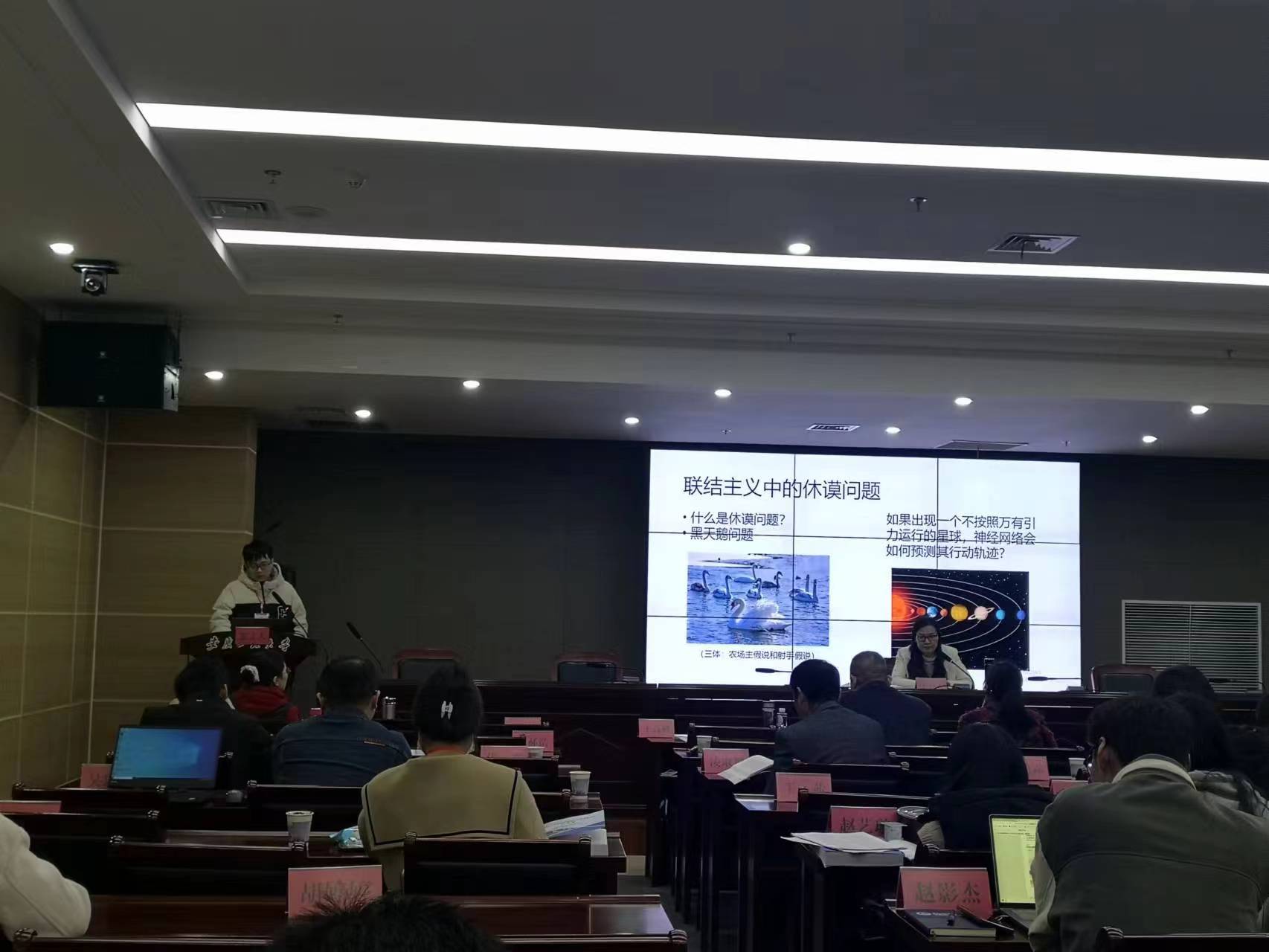 会议由三个部分构成。第一部分是主题报告:中国科学技术大学的刘立教授、安徽大学的王金柱教授、安徽师范大学的吴兴华教授分别就各自的学术研究进行了主题汇报。第二部分是专题报告:来自安徽省各大高校的专家、学者进行了学术汇报。我院郭金明教授发表了题为“‘自然辩证法概论’课堂上的猜想”的学术汇报;我院毛郝浩讲师发表了题为“联结主义与联想主义的比较研究 ”的学术汇报。第三部分是探讨交流:来自安徽省各大高校的硕士研究生和博士研究生进行了学术汇报,各位专家、学者进行了点评。最后,在年会闭幕式上,徐飞理事长进行了总结发言。