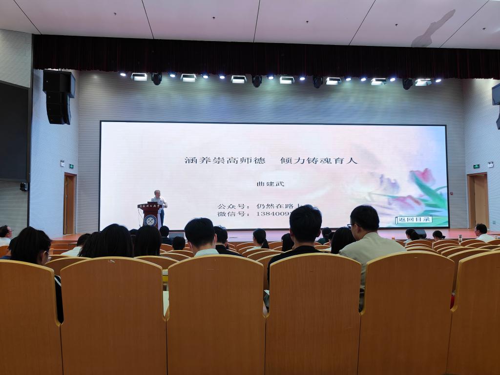 曲建武教授以“涵养崇高师德倾力铸魂育人”为主题,分别从传承大学文化之德、增强政治意识之德和怀有知恩图报之德三个方面,详细解读了高校教师应该如何“涵养崇高师德”;从坚定理想信念、工作脚踏实地、为学生解疑释惑、激励学生为祖国而学习和关心学生生活五个方面,深刻诠释了高校教师应该如何“倾力铸魂育人”。通过一个个丰富深刻的育人案例,一则则情真意切的帮扶事迹,一封封寓教于情的书信、一次次真挚感人的家访谈话,展现了他心系国家、爱生如子的高尚情操和对教育事业的岁月坚守与执着追求。
