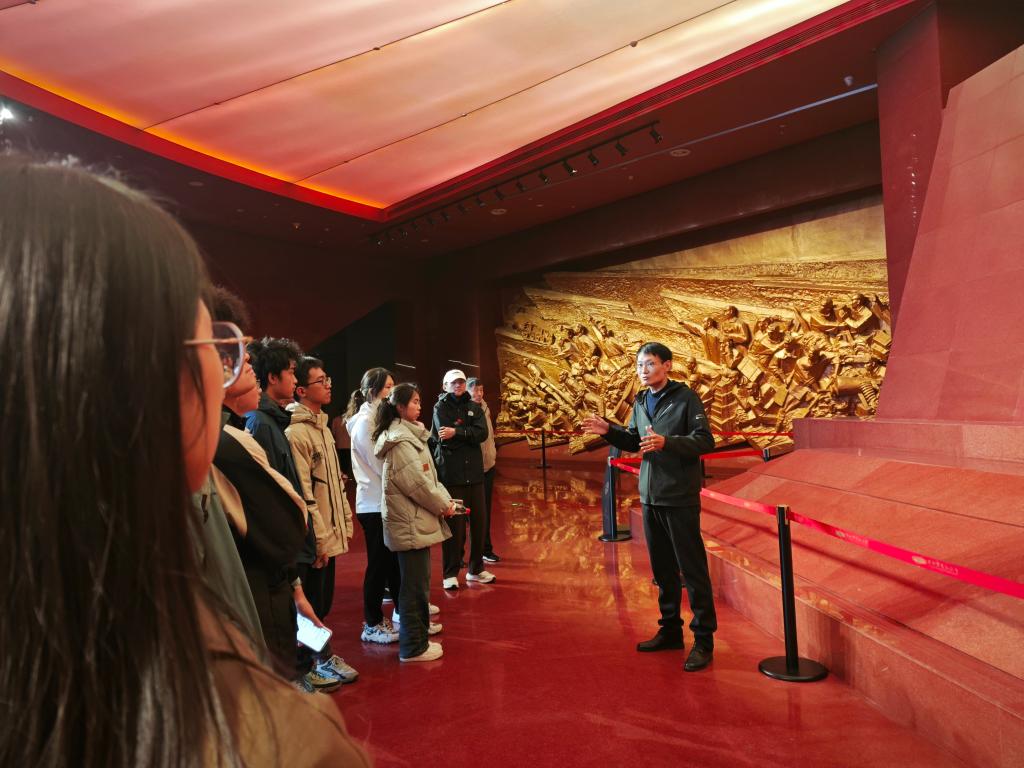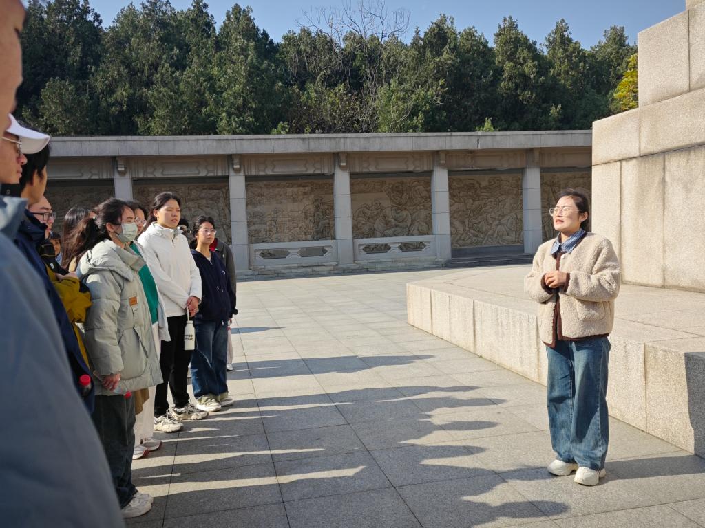 走出展馆,同学瞻仰了淮海战役烈士纪念塔。在“人民奋勇支前浮雕”前,杨帆老师用一组数字回顾了淮海战役中全民支前、全员支前的感人画面,并从革命精神、牺牲精神、奉献精神三个层面分析了“小推车精神”的深刻内涵和现实启示。