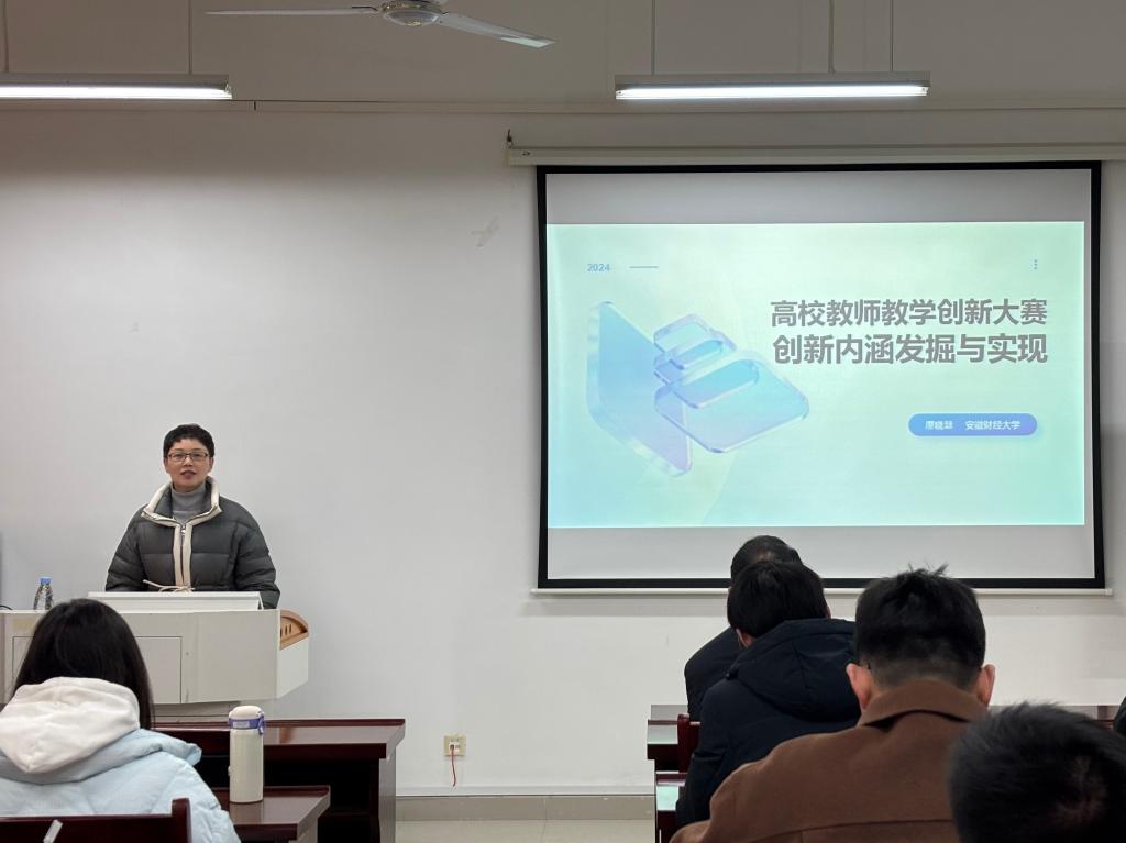 本次备课活动邀请首届全国高校教师教学创新大赛一等奖获得者、安徽财经大学副教授廖晓慧老师主讲。廖老师以“高校教师教学创新大赛创新内涵的发掘与实现”为题,从教创赛的角度分享了备课备赛的经验。她从教学创新大赛的评分三大标准切入,结合自身丰富的参赛经验和日常教学积累,深入剖析了三大模块的重要内容与实际操作。针对“教学创新设计”,从教学理念、教学内容、教学过程、教学评价四方面展开阐述,指出存在的误区,并进行痛点反思。针对“课堂教学实录”,廖老师特别强调,教师要充分理解混合式教学的本质,灵活运用教学资源,注重课前、课中和课后的有效衔接,提高课堂教学的互动性与有效性。针对“教学创新成果报告”,指出要坚持问题导向,减少描述性语言,多使用意图性表述,从根本上明确教学目标与创新路径。