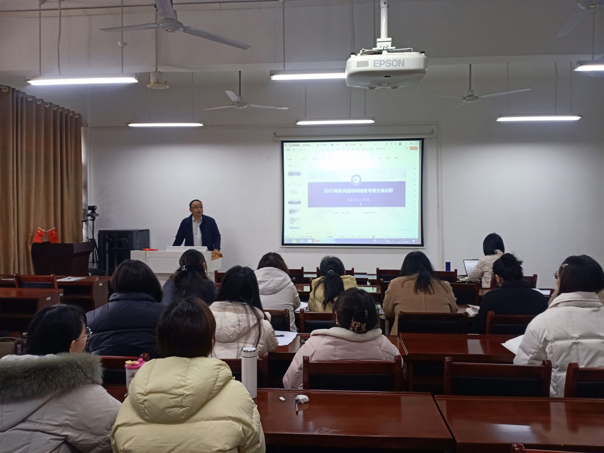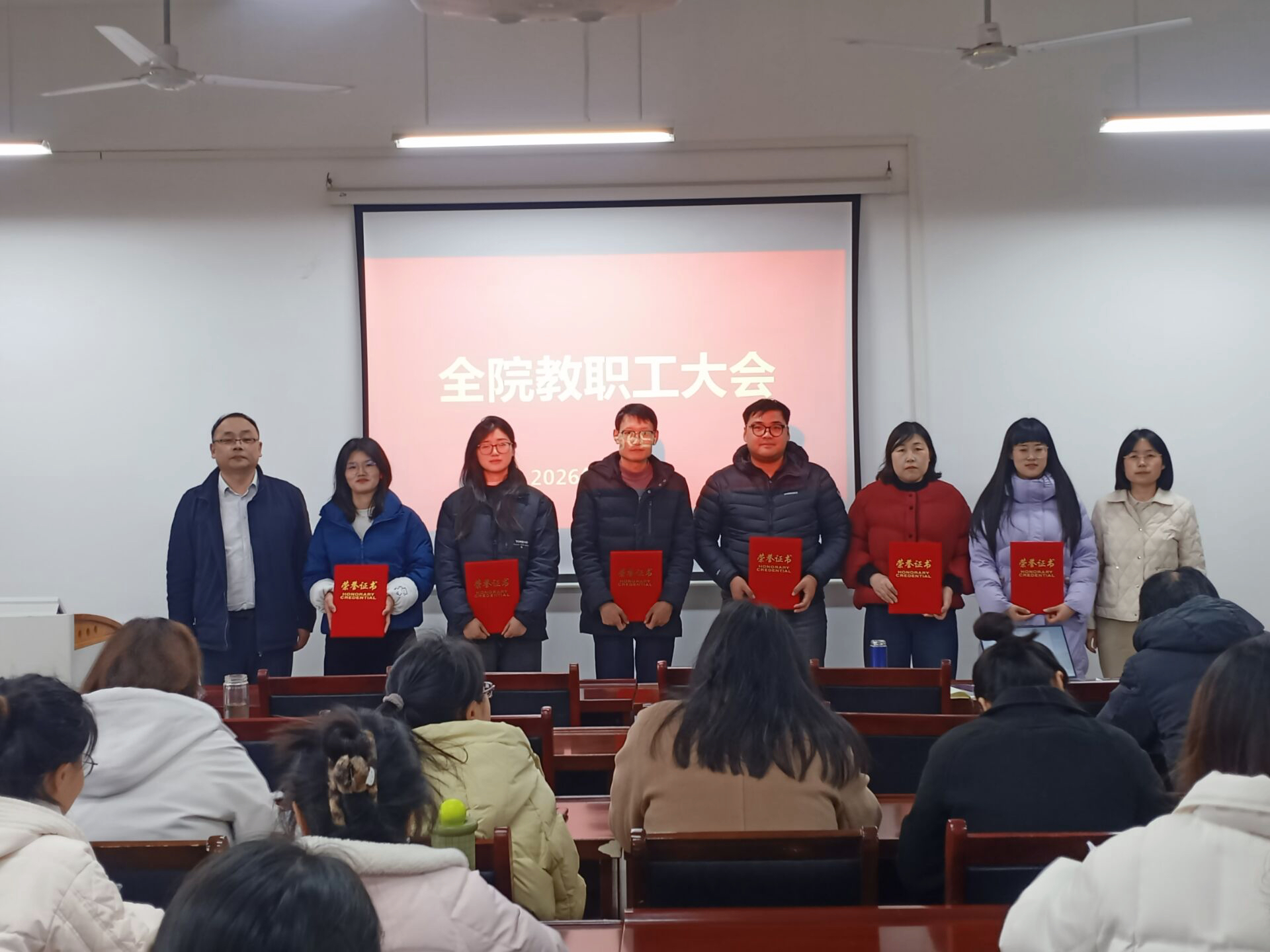 朱广亮作工作报告,系统总结2025年度学院在十个方面取得的成就,学科建设稳步提升;科研成果显著,国家级项目立项创新高;师资队伍结构优化,高层次人才引进与青年教师培养并进;社会服务能力增强,研究生培养质量保持高位;党建工作与业务深度融合,集体备课制度完善,实践教学基地扎实推进,“大思政课”格局日益形成。他强调,新学期要对标“双一流”建设目标,找准差距精准发力。
