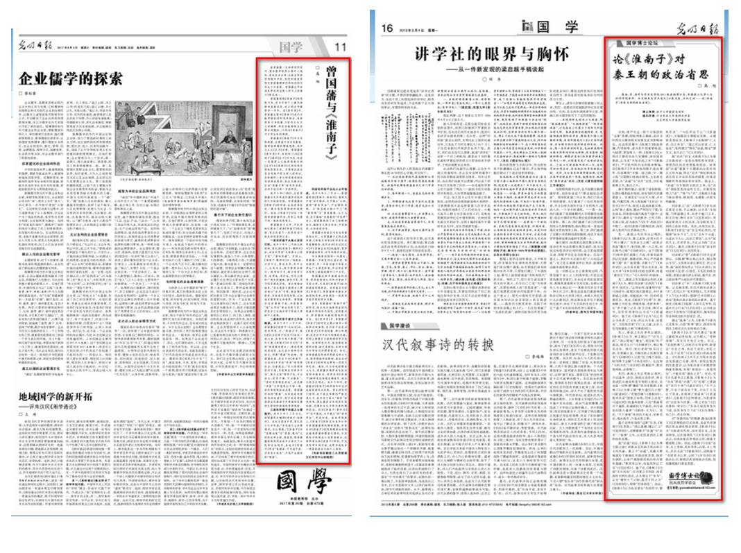 8月5日,我院高旭副教授在《光明日报》第11版“国学”发表题为《曾国藩与<淮南子>》的学术论文,全文2300余字。这是高旭副教授在《光明日报》再次刊发《淮南子》研究专文。2013年3月4日,高旭副教授便曾在《光明日报》第16版“国学”刊发《论<淮南子>对秦王朝的政治省思》一文(3000余字),该文发表后引起国内众多中央与地方网络媒体的关注和转载,包括光明网、人民网、中国社会科学网、搜狐网、国学网、中新网、中国日报网、中华主流文化网、中国文明网、辽宁新闻网、乐山新闻网等。