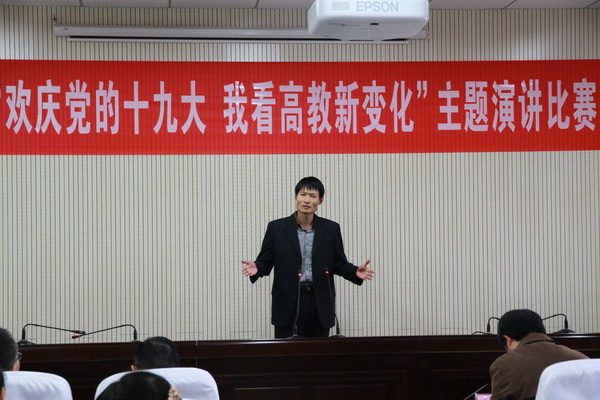 11月14日下午,党委宣传部在静远楼B406室举办了“欢庆党的十九大,我看高教新变化”主题演讲比赛。由基层党委推荐的13名教师代表参加了比赛。党委组织部、纪委办公室、审计处、党政办公室和党委统战部相关领导担任评委。我院代先祥老师荣获主题演讲比赛一等奖。